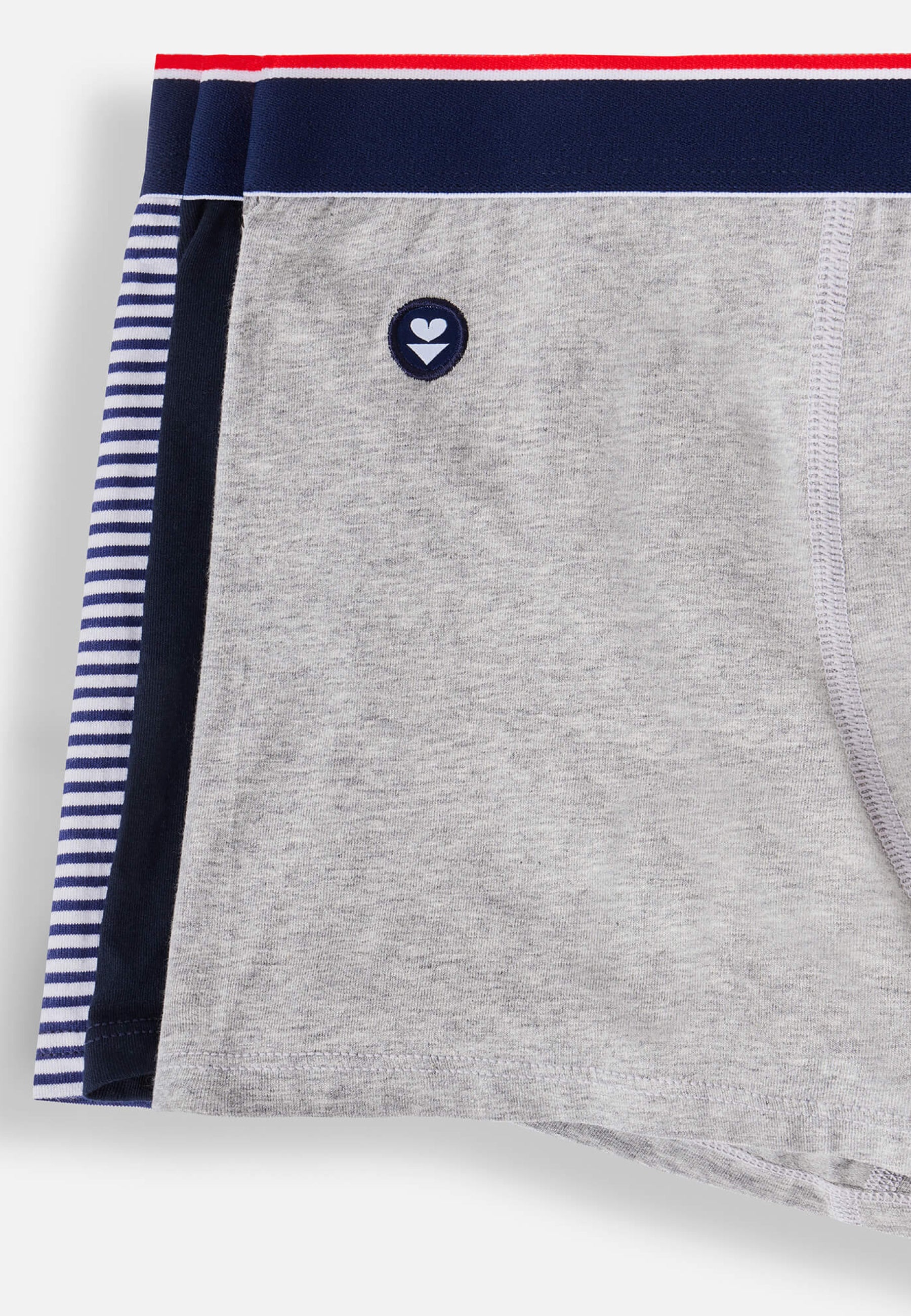 - Design : 2 boxers unis – bleu marine et rouge + 1 rayé blanc & bleu